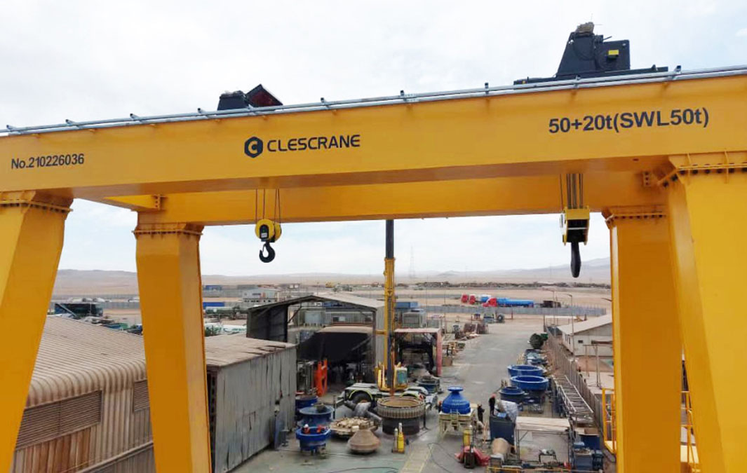 In February 2021, Chilean Metal Products Company ordered a double girder gantry crane of 50 tons + 20 tons (CHGD50T + 20T-10M H=12M A5) from Clescrane, which is used for hoisting the wearing parts of mining machine equipment.