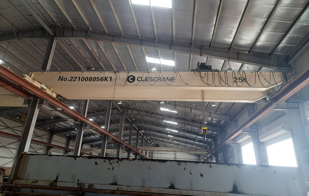 In June 2021, Kuwait Burgan Drilling Company ordered 2 sets double-girder overhead cranes of 25 tons (CHD25t-16m H=6m A5/M5) from CLESCRANE, with pendant and remote control operation. So far, Kuwait Burgan Drilling Company has ordered a total of 6 overhead cranes and 2 wire rope hoists from CLESCRANE, of which 2 wire rope hoists are used to replace the old STREET hoists. These cranes and hoists are all used on the factory in Kuwait. These two overhead cranes 25 ton will be used together with the previous four overhead cranes 12 ton. Each overhead crane 25ton will be placed between the two CHD overhead cranes 12 ton on each span.