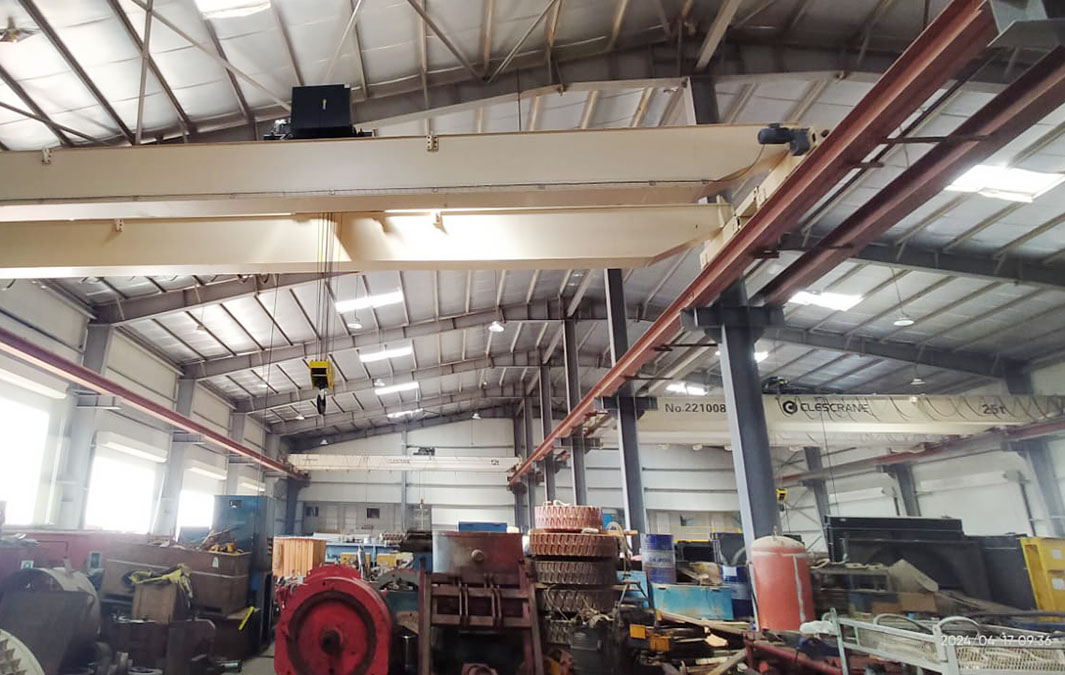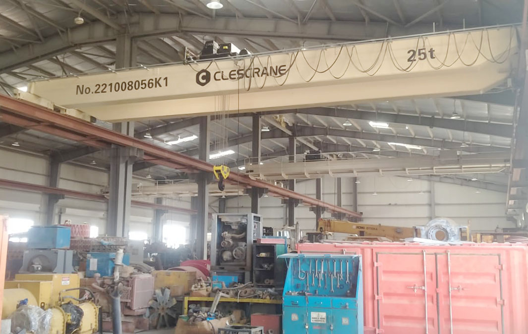 In June 2021, Kuwait Burgan Drilling Company ordered 2 sets double-girder overhead cranes of 25 tons (CHD25t-16m H=6m A5/M5) from CLESCRANE, with pendant and remote control operation. So far, Kuwait Burgan Drilling Company has ordered a total of 6 overhead cranes and 2 wire rope hoists from CLESCRANE, of which 2 wire rope hoists are used to replace the old STREET hoists. These cranes and hoists are all used on the factory in Kuwait. These two overhead cranes 25 ton will be used together with the previous four overhead cranes 12 ton. Each overhead crane 25ton will be placed between the two CHD overhead cranes 12 ton on each span.