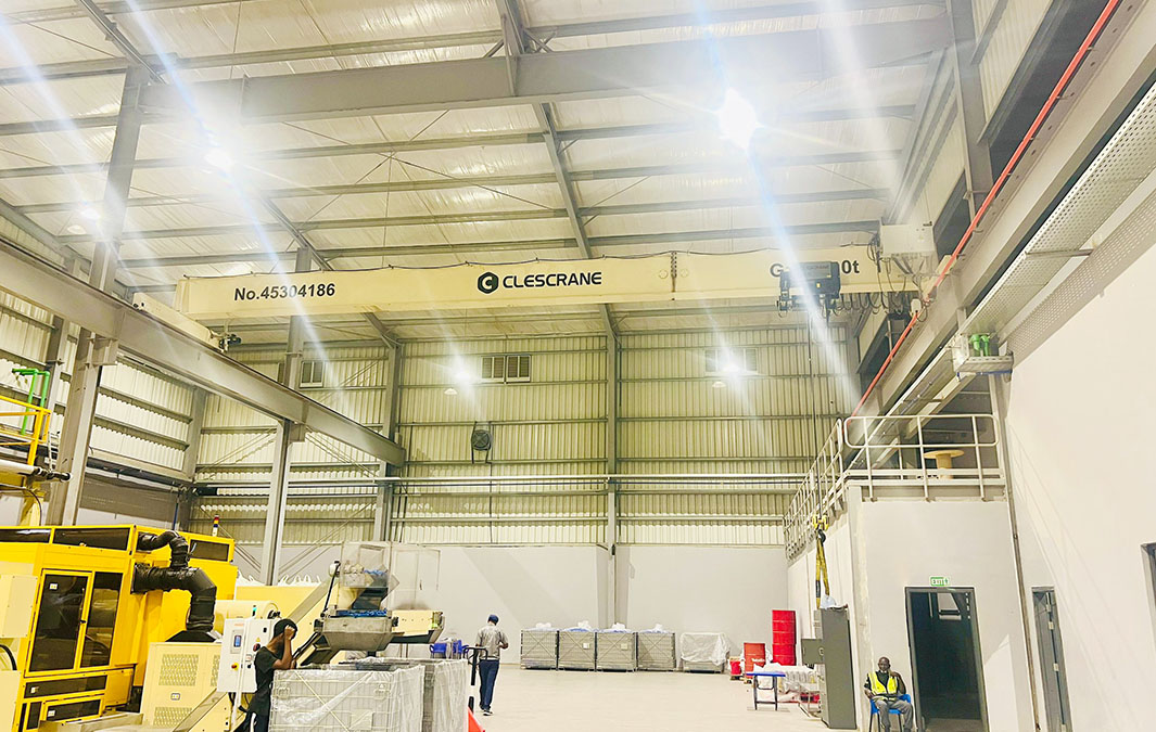 A long-time customer in Ghana once again chose CLESCRANE and ordered a 10-ton overhead crane (CHS10t-16m-7.35m, A5/M5 pendant control) for their new injection molding production line equipped with a Husky system. The continued trust from our customers remains our greatest motivation. The end user, Blow Group of Companies, is one of the leading industrial groups in West Africa, with a wide portfolio covering beverages (alcoholic and non-alcoholic CSD), mineral water (PET/glass), PET packaging (preforms and caps), flexible packaging (PE extrusion, multilayer films, PP sheets, thermoforming, vacuum forming), and tissue conversion (toilet rolls, kitchen towels, napkins, pocket tissues). This new injection molding project marks an important step in enhancing their high-precision packaging capabilities.